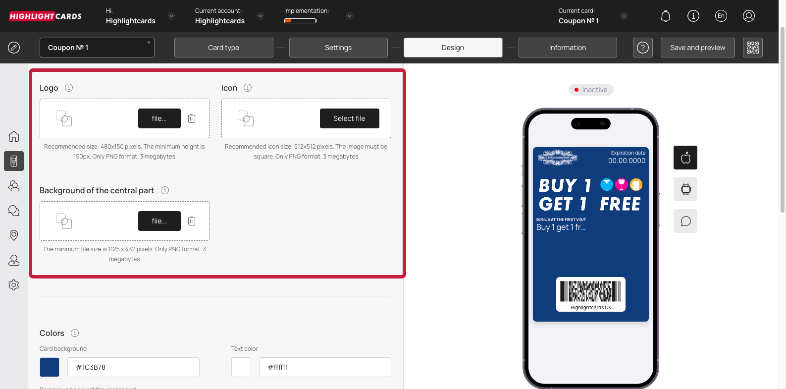4. Choose an icon from your system storage for the center of the card by clicking the Select File button under the **Background of the central part** heading.