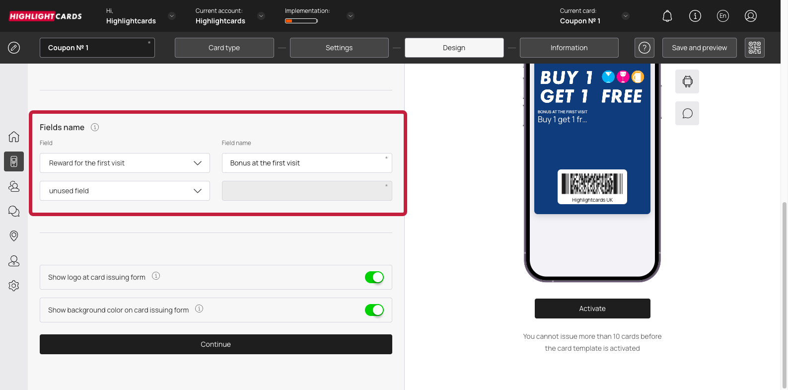 8. In case you want the logo to appear on the Card Issuing Form, enable the Show logo at card issuing form toggle button.