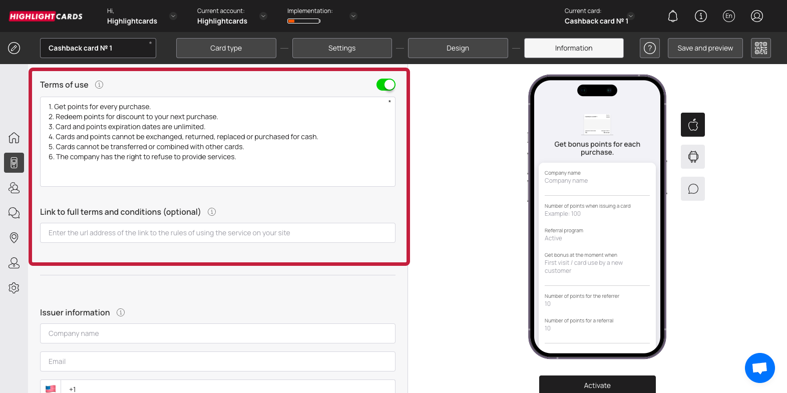 19. In case you want to include Terms of use on the card, enable the toggle button next to Terms of Use heading.