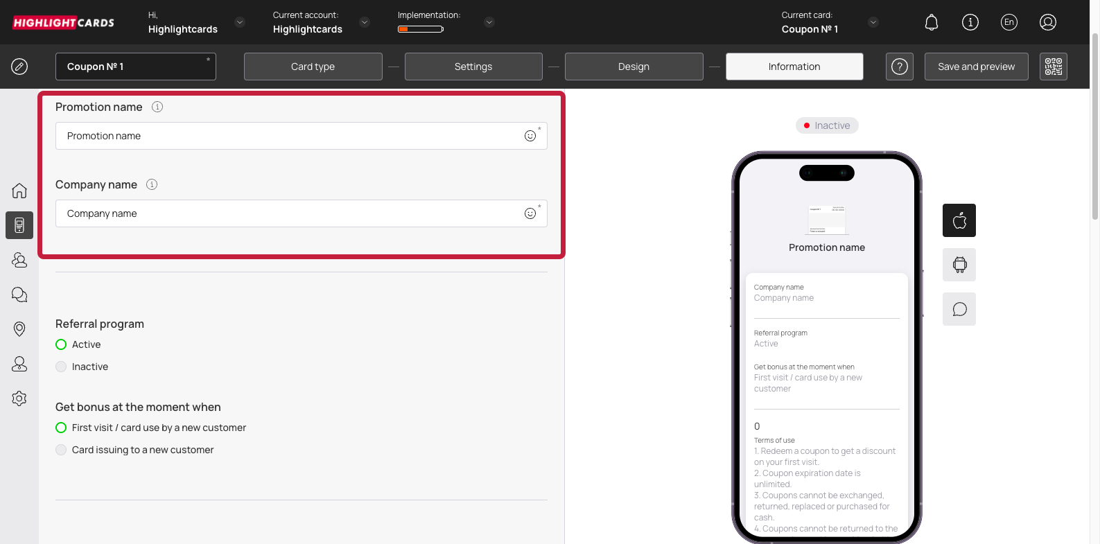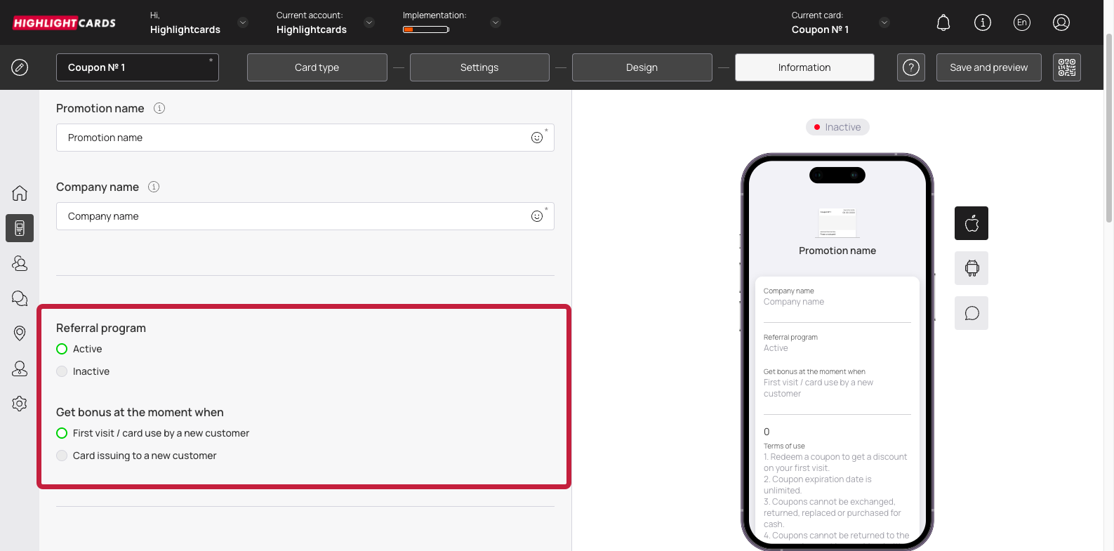 4. In case you want to activate referral program on the coupon card, choose the Active radio button under the **Referral Program**.