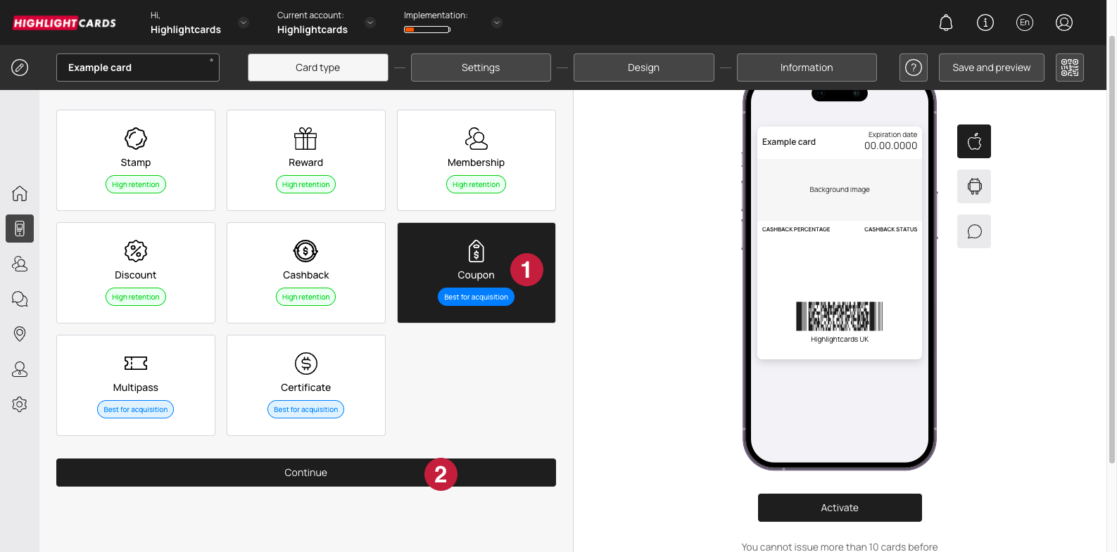 1. This section lets you choose the type of card you want to create. Since we are creating a coupon card, select **Coupon** from the types available.<br>