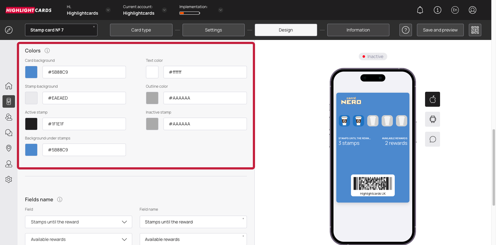 10. &#x20;From the Colors section, you can set the colors for Card Background, Text Color, Stamp Background, Outline Color, Active Stamp, Inactive Stamp, and Background under stamp.