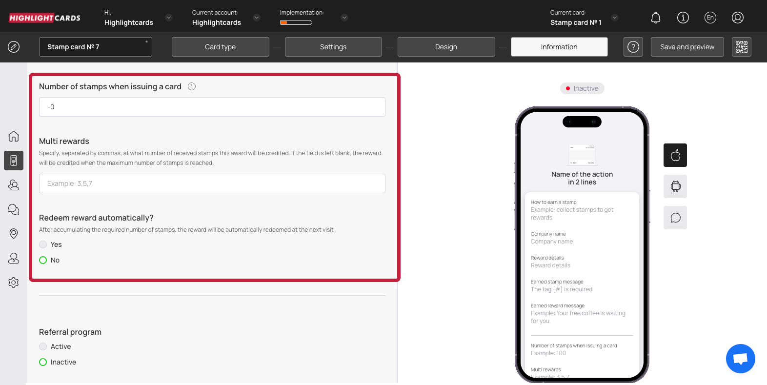13. Choose how many stamps a customer earns upon sharing their card via the referral program using the **Stamps count for referrer** heading.