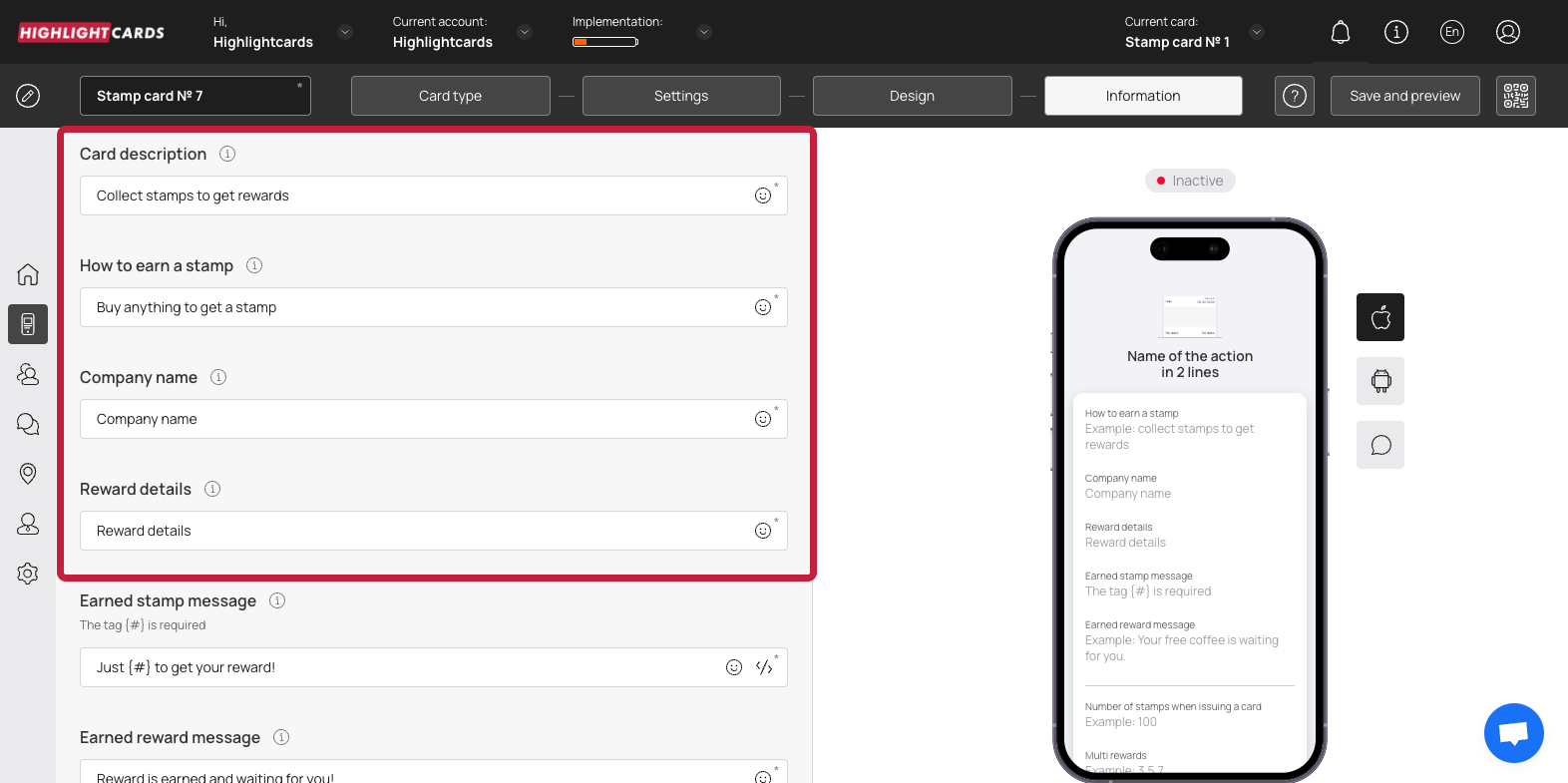 1. This section lets you fill relevant information in the card. The impact of each field can be viewed in the mobile screen preview displayed on the right side of the screen.<br>