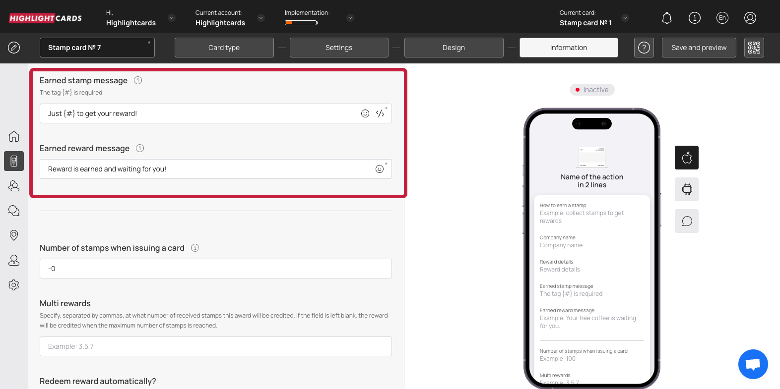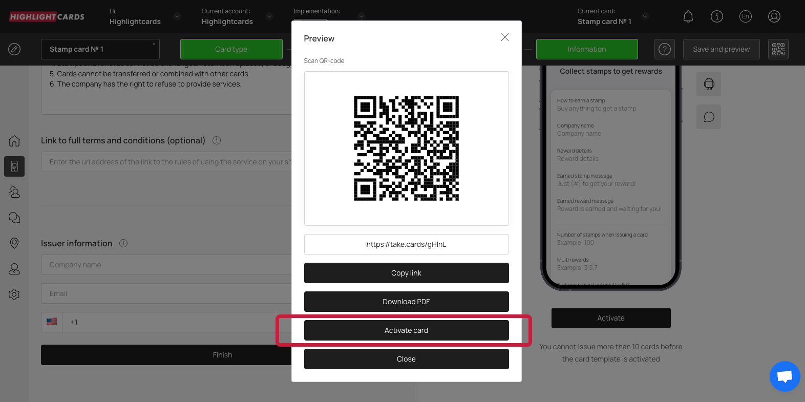 8. Moving further, define the number of stamps a customer should earn for a card to be issued using the **Number of stamps when issuing a card** field.