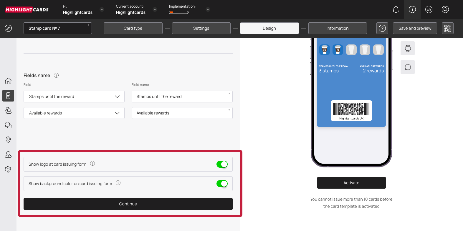 13. In case you want the logo to appear on the Card Issuing Form, enable the Show logo at card issuing form toggle button.