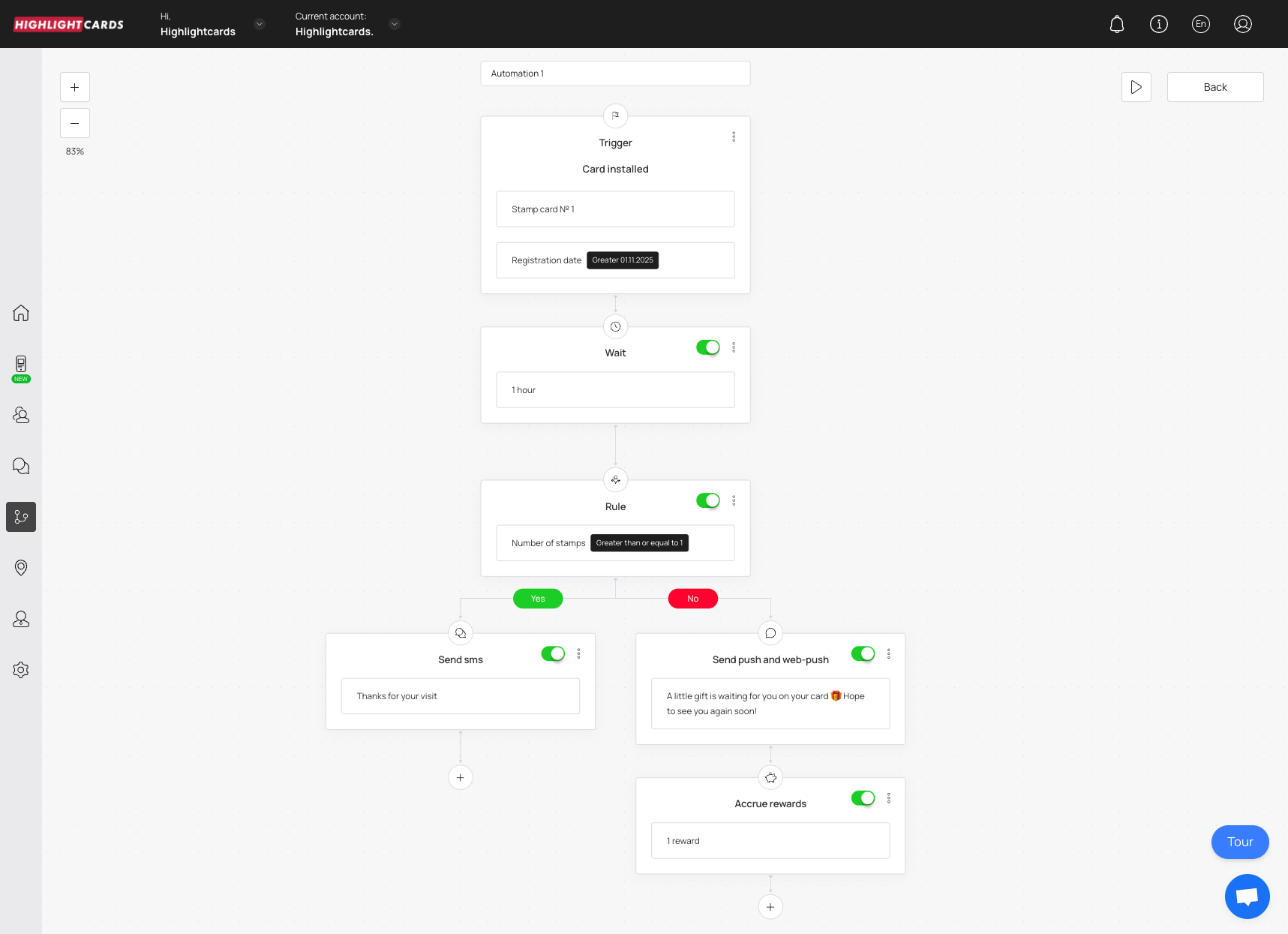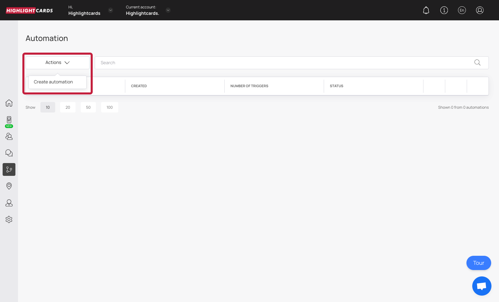 To create a new automation, open the [Automation](https://app.highlightcards.co.uk/automations) section and click **Create automation** in the action menu.